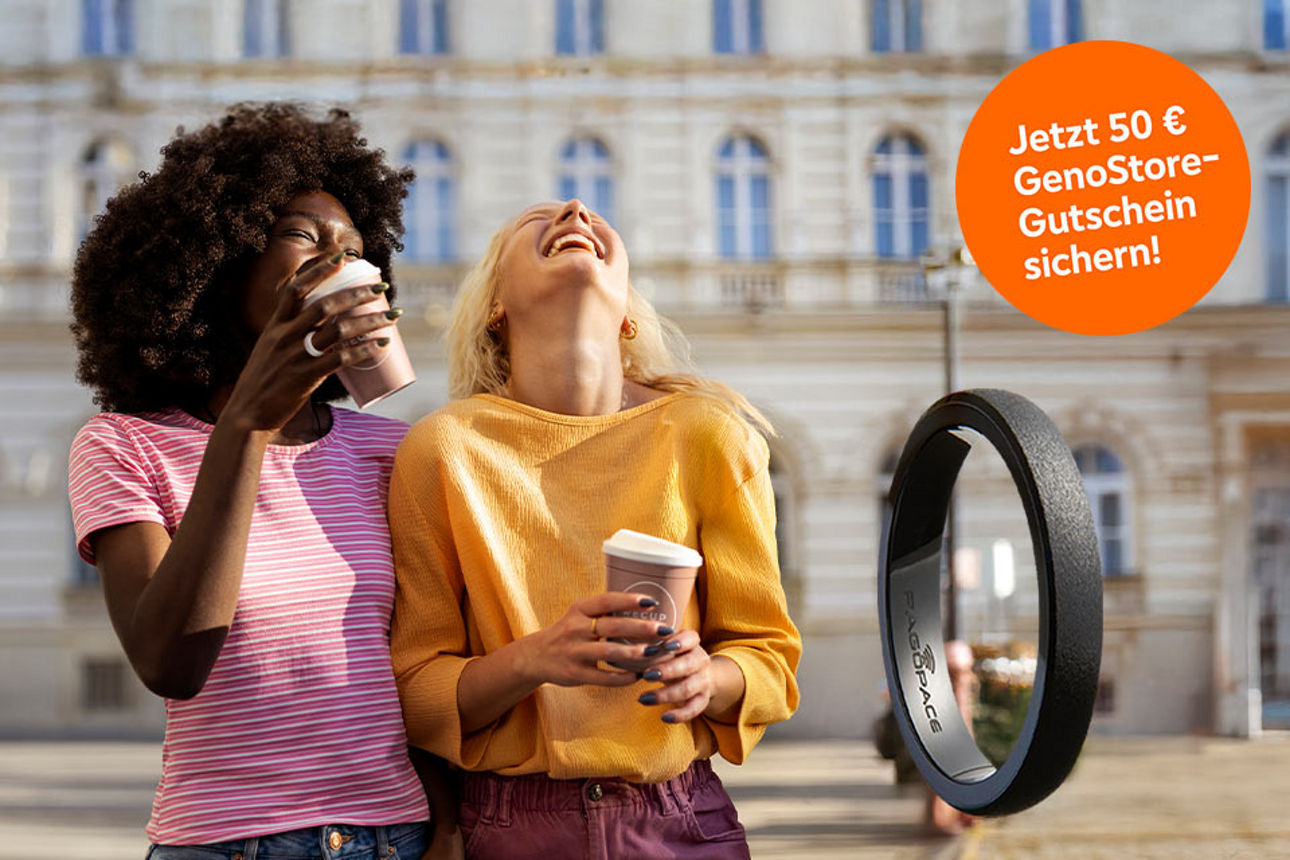 Zwei lachende junge Frauen mit Coffe-to-go-Bechern in der Hand, beide tragen Wearables wie Bezahlring und Uhr
